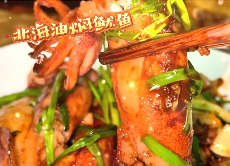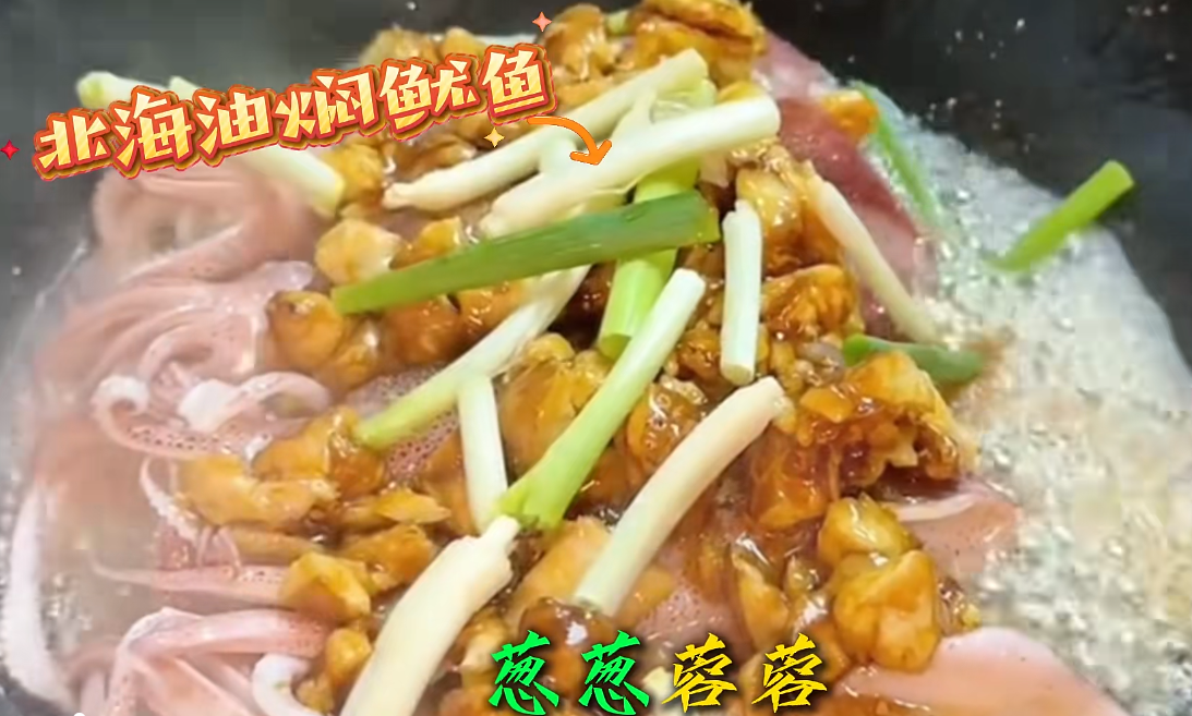 北海焖鱿鱼是当地经典海鲜菜,当然少不了歌词中所说的“葱葱蓉蓉”(葱花、蒜蓉)。北海小鱿鱼有了葱花、蒜蓉、酱油、蚝油、料酒、糖等配料加持,不需要厨艺就能够“焖”出一道咸鲜合一、口感脆嫩弹的好菜。